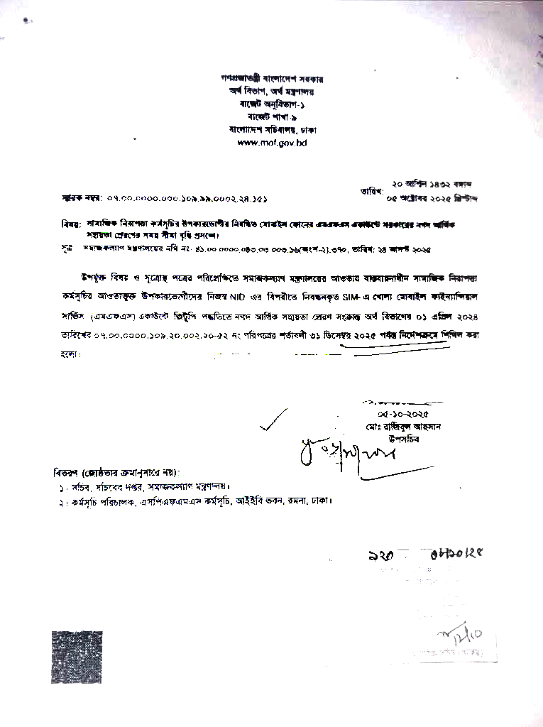সামাজিক নিরাপত্তা কর্মসূচীর উপকারভোগীদের নিবন্ধিত মোবাইল ফোনের এমএফএস একাউন্টে সরকারের নগদ আর্থিক সহায়তা প্রদানের লক্ষ্যে লাইভ ভেরিফিকেশন কার্যক্রমে সহযোগিতাকরণ প্রসঙ্গে।